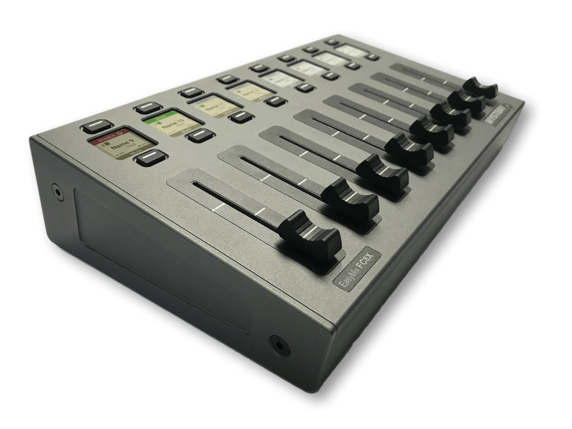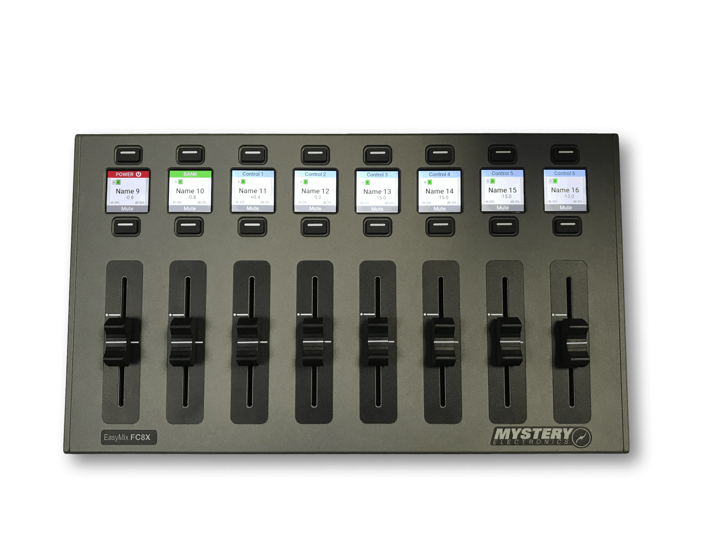 Easy Mix FC8X – DSP Control SurfaceThe DSP Control Surface shall provide remote control capabilities to supported digital signal processors over Ethernet. DSP Control Sur-face shall be equipped with eight (8) each physical fader channels and eight (8) Full-color HD displays. Each channel shall provide one (1) each 60 mm touch-sensitive motorized fader and two (2) each programmable functions via backlit tactile push button switches. DSP Control Surface shall provide programmable control of up to sixteen (16) each gain controls and additional field programmable functions within the device. The DSP Control Surface shall support the programming of eight (8) each customizable tactile push buttons and shall be able to be field programmable to control fader bank selection, EQ, presets, or logic functions depending on the options available for each digital signal processor. All tactile backlit push buttons shall be momentary, non-latching and shall provide integral LED status indi-cation. All program memory shall be non-volatile with no batteries required. Device setup shall be accessible using a built-in web server hosted within device and accessible with a web browser. DSP Control Surface shall have the following rear mounted connector: Ethernet RJ45. DSP Control Surface shall be constructed of and all electronics shall be enclosed in a matte gray, powder coated machine alumi-num chassis. DSP Control Surface shall be rack mountable in 4RU. DSP Control Surface faceplate shall in addition to make and model include a laminated positioning designation overlay at each fader. DSP Control Surface shall be Mystery Electronics EasyMix FC Series, model number FC8X. Note: If rack-mounting, additionally specify Mystery Electronics EasyMix FC Series rack-mounting hardware, part numbers: 1ea FCRMHW and 1ea FCRMFL.