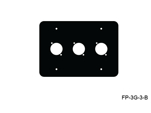FP-3G-3-B – Gang Wall Panel, Satin Black (Ceramic Coated) Wall panel shall be of 14 gauge steel, shall have radiused corners to .375, shall accommodate three (3) FlexiConn / Neutrik D connector or equivalent, and shall be provided with #6 stainless steel screws. Panel shall have a ceramic plastic satin black finish so as not to create specular light reflections. Panel shall mount on standard trade size gang box. Panel shall be Mystery Electronics FP-3G-3-B.
