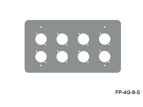 FP-4G-8-S – Gang Wall Panel, Satin Black (Ceramic Coated) Wall panel shall be of 14 gauge steel, shall have radiused corners to .375, shall accommodate eight (8) FlexiConn / Neutrik D connector or equivalent, and shall be provided with #6 stainless steel screws. Panel shall mount on standard trade size gang box. Panel shall be Mystery Electronics FP-4G-8-S.